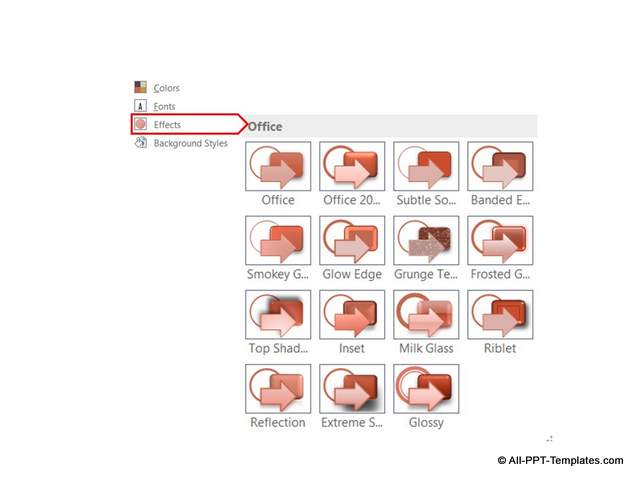 You can apply a number of interesting effects to customize PowerPoint design themes. Each effect adds a subtle variation to the editable graphics in the design.