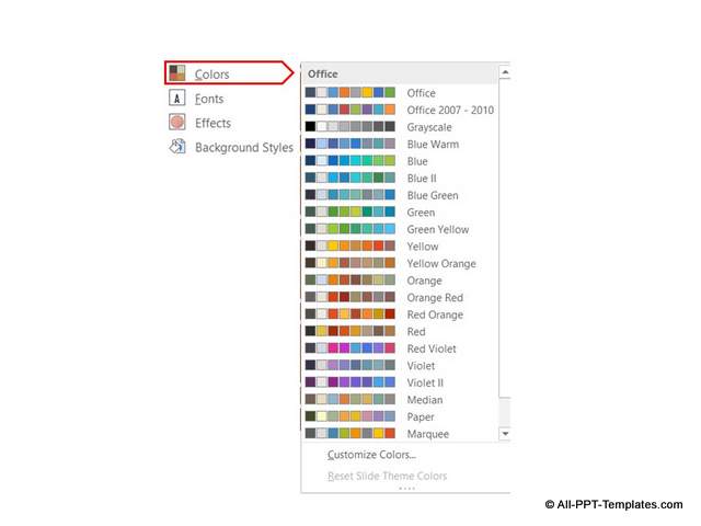 As you browse through the color theme presets you can preview the change reflecting in the slide. If you are not happy with the color theme presets, you can customize colors by going to the option at the bottom of the menu.