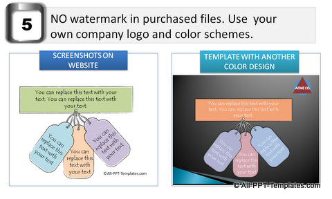 There are no watermarks in the files you will download on purchase. They are just used online to prevent misuse of our template screenshots. You can add your own corporate logo and scheme to your presentation. |