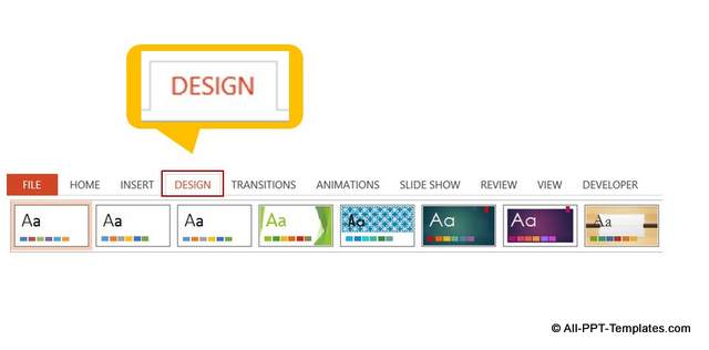 To apply a design theme go to ‘Design’ tab in the PowerPoint ribbon. You can browse through the various design theme options available as shown below: