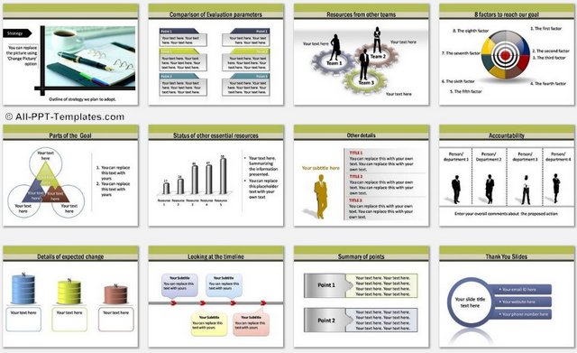 Breakdown of Goal - Overall strategy statement - Comparison charts - data-driven & editable - Resources required - Factors to reach goal - Goal components puzzle chart - Resource status bar chart - Accountability to teams/ individuals Summary and Close - Timeline or next steps chart - Summary of Points - Thank you slide
