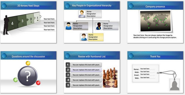 This set is useful for creating a business profile or company presentation for sales / marketing presentations, sharing online on company website or for Human Resources team to present about the company. Suitable templates to present the company background, personnel, locations, strategy , products/ services etc. are provided.